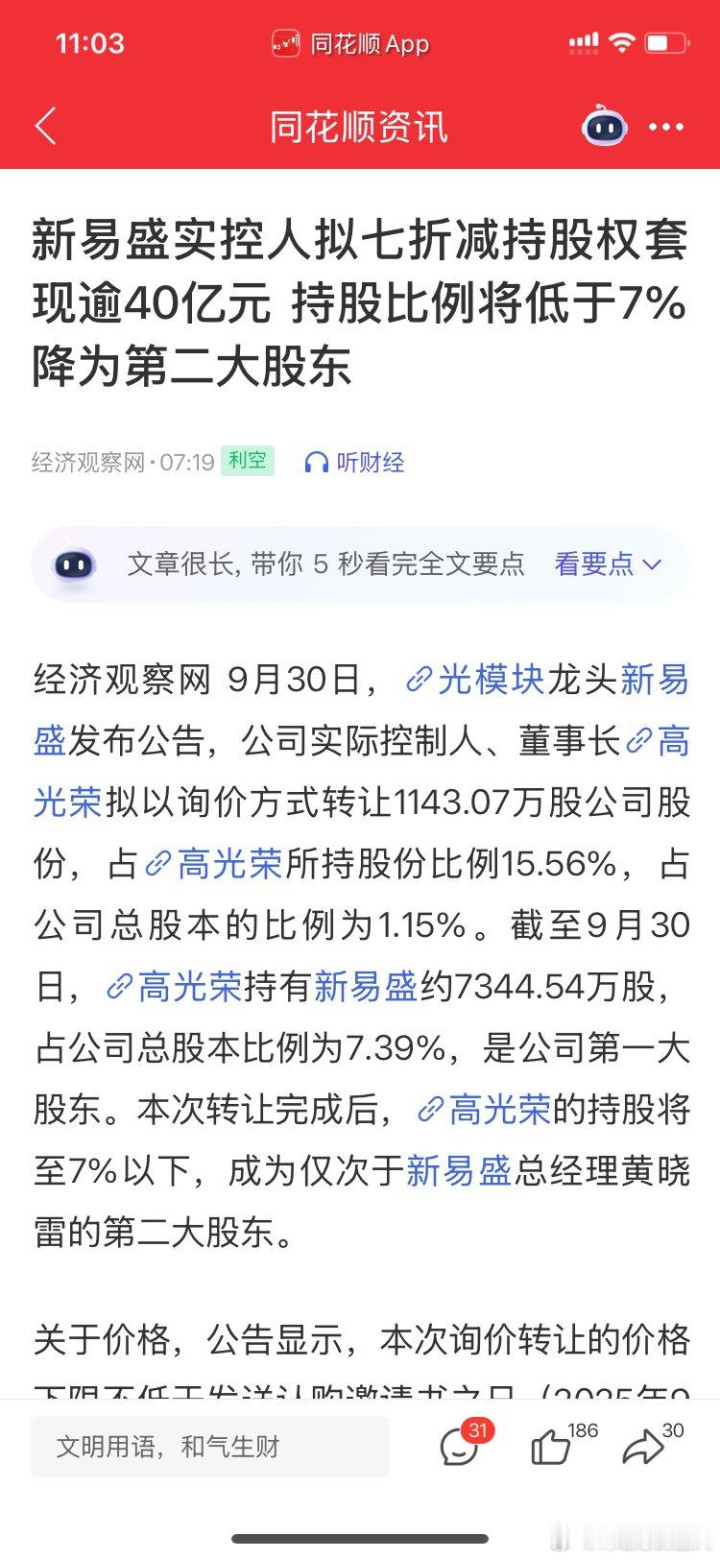 股顺网 新易盛实控人拟七折减持套现40亿元