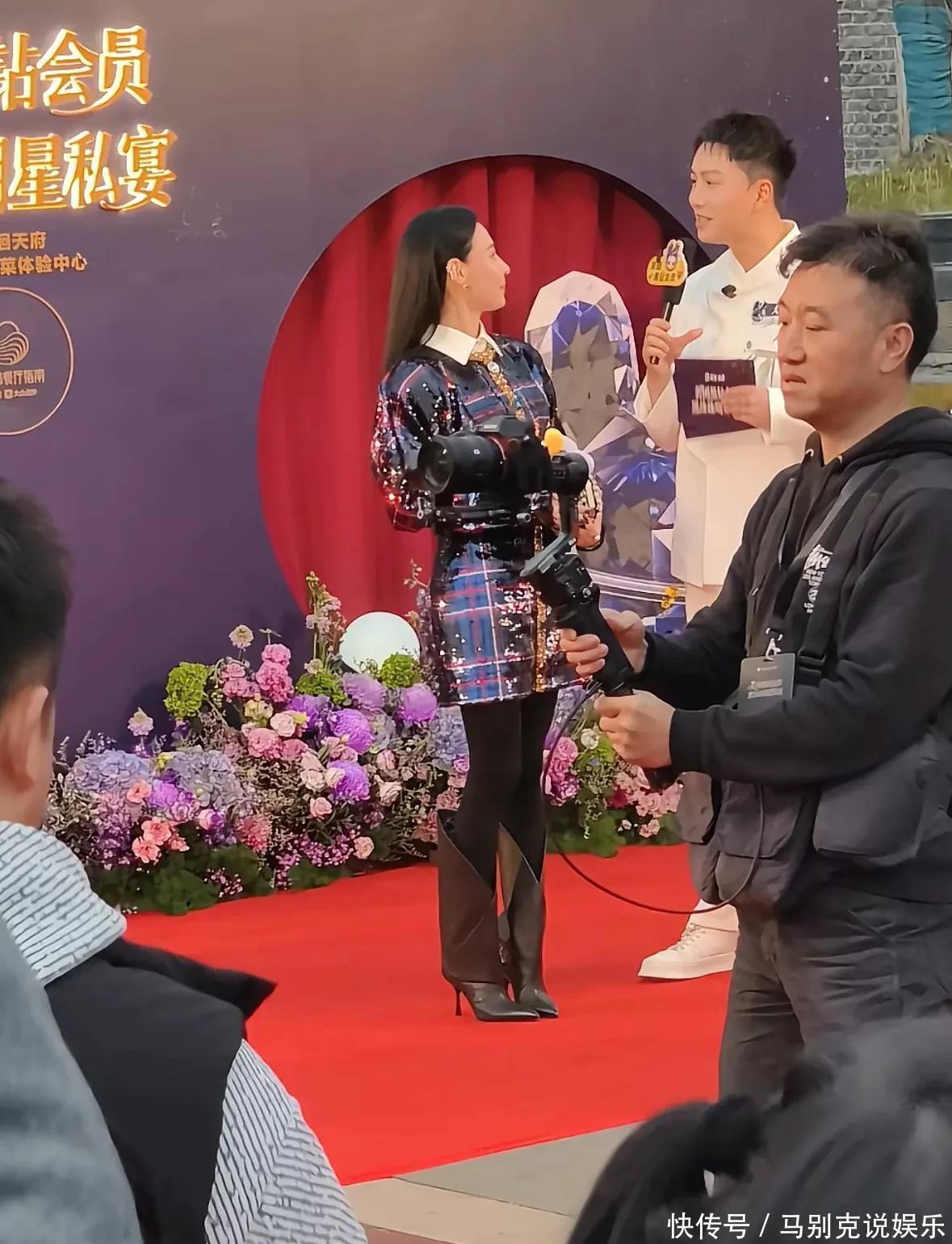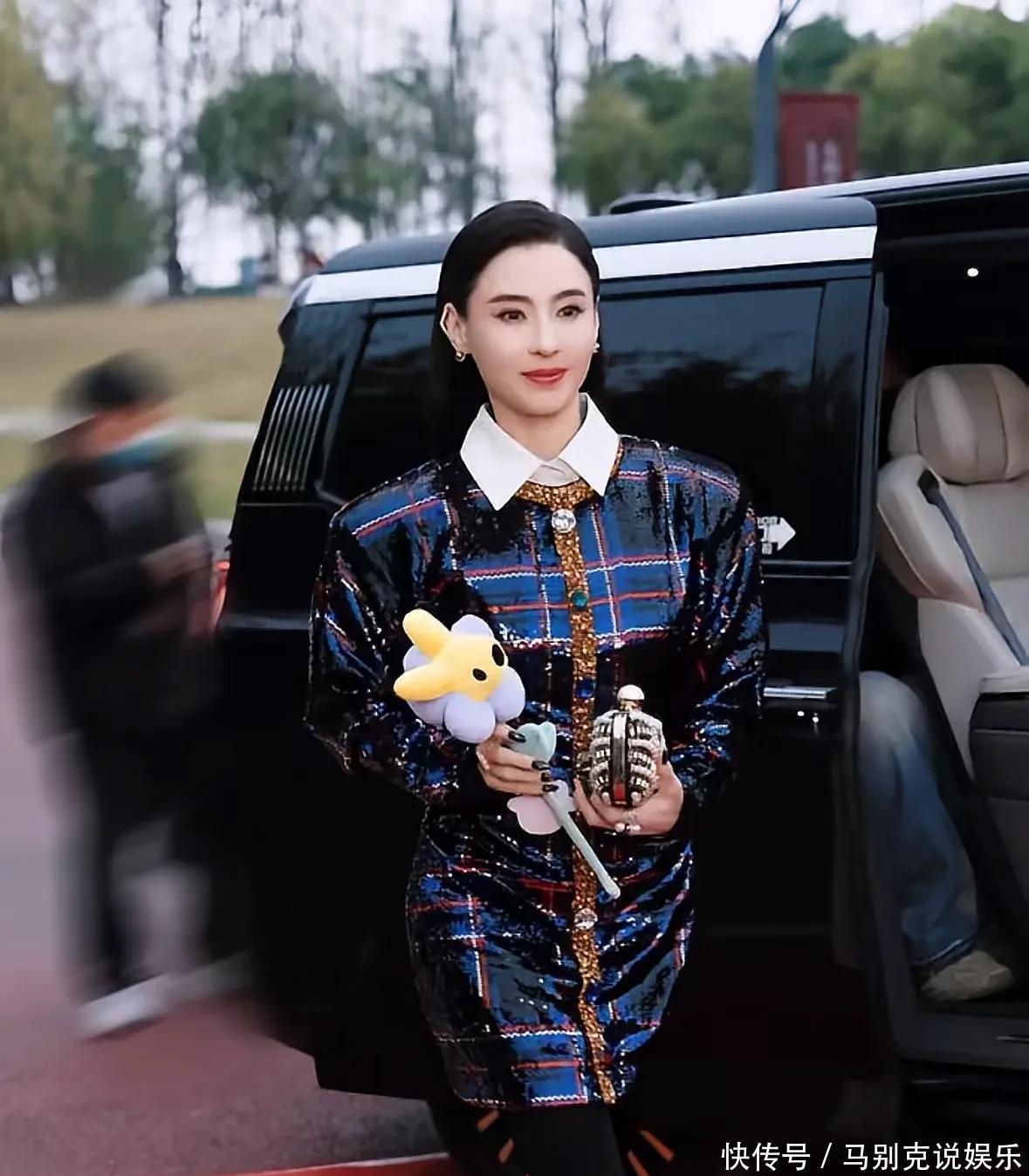 在正式活动中旗开网,她的造型发生了鲜明转变,张柏芝身着一件布满细致亮片刺绣的连衣裙登场,裙装的宽肩设计强调了肩部线条,搭配同色系的过膝长靴,整体造型完整且充满力量感,在灯光下,衣着的亮片材质随着她的行动泛起柔和光泽,与她利落的黑长直发型相得益彰,塑造出一种精致而大气的视觉效果。